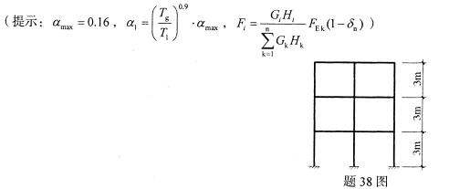 38.两跨三层框架如题38图所示.各层层高均为3m,框架边柱侧移刚度相等,中柱的侧移刚度是边柱的1.2倍,各层的重力荷载代表值均为2400kN,结构的基本自振周期为0.4s,场地特征周期为0.3s,抗震设防烈度为8度.试用底部剪力法计算该框架第3层中柱的地震剪力.